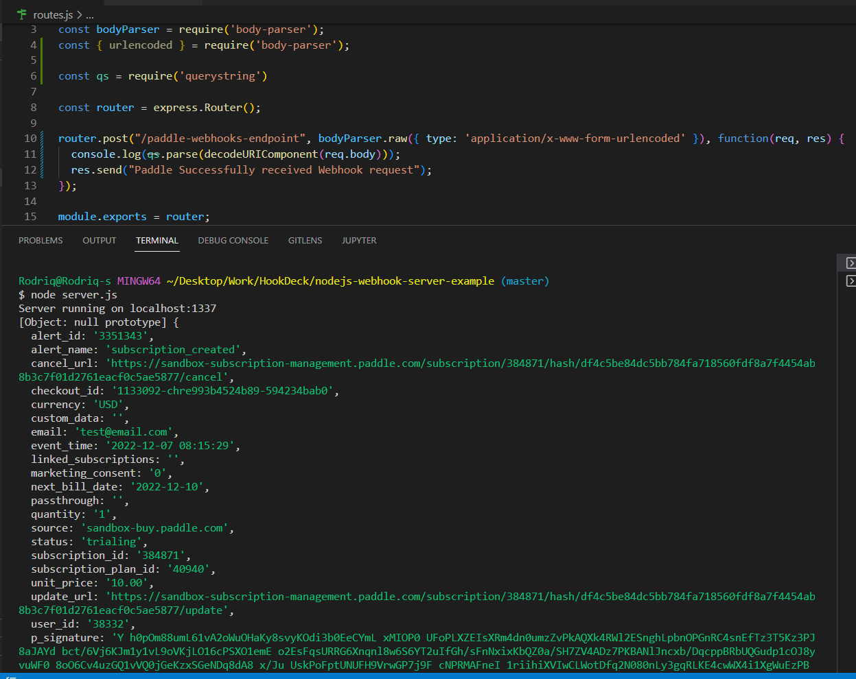 - Back in the terminal of the localhost application, the successful payload from the webhook is received and logged